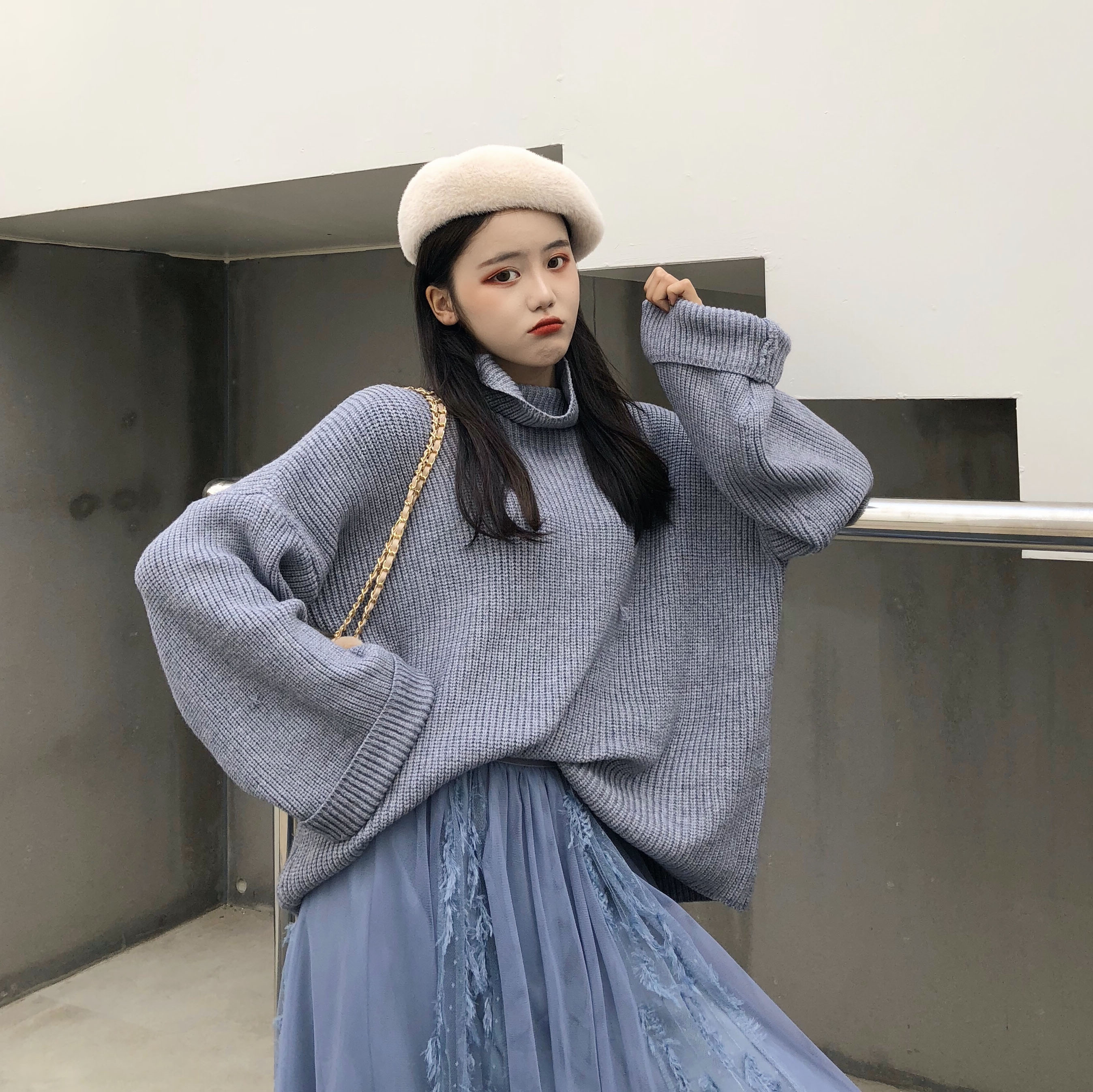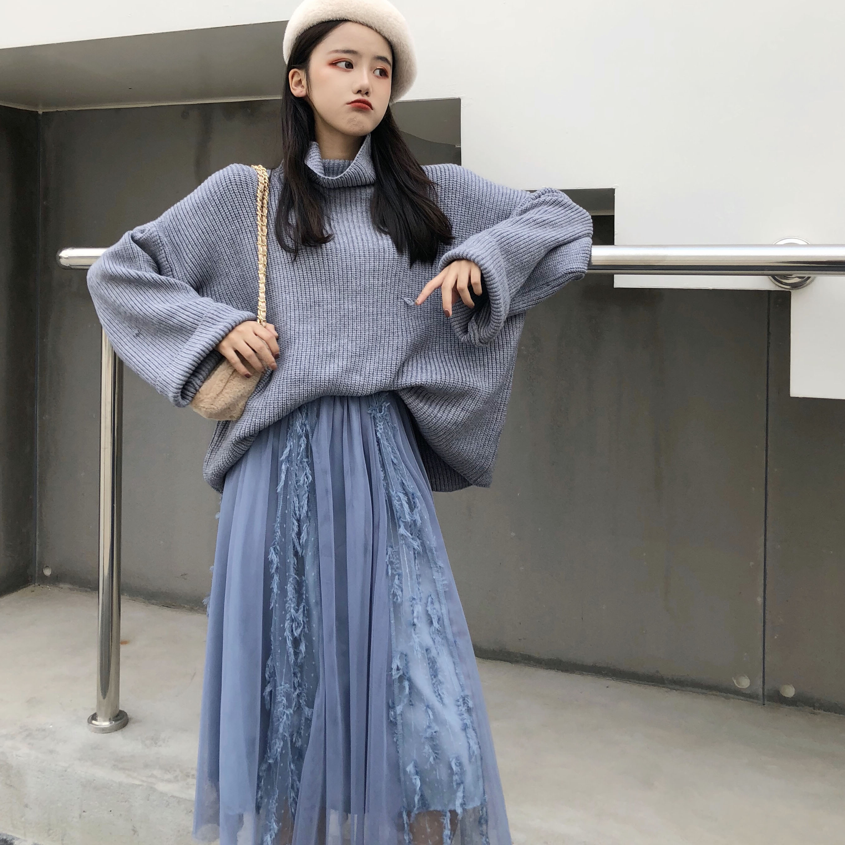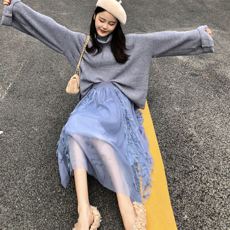 / 港味chic慵懶風高領毛衣女秋冬2018新款+流蘇蕾絲拼接網紗半身裙