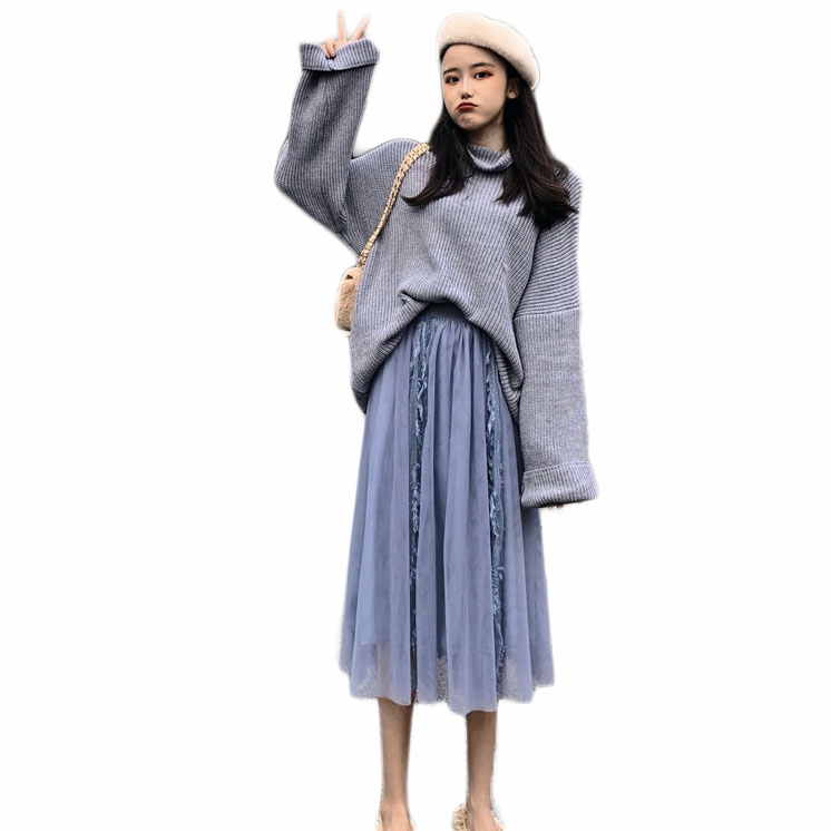 港味chic慵懶風高領毛衣女秋冬2018新款+流蘇蕾絲拼接網紗半身裙