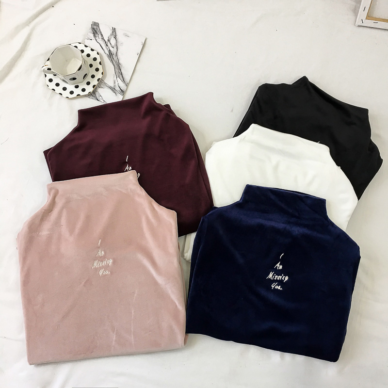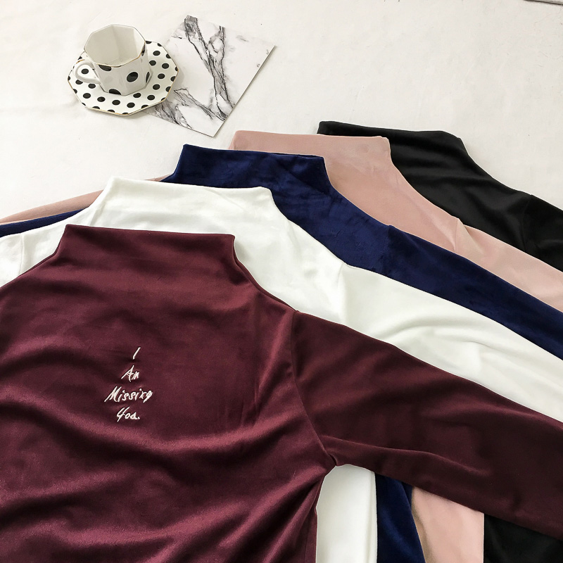 / 糖果色字母刺繡小高領打底衫秋裝女2018新款氣質絲絨修身T恤上衣