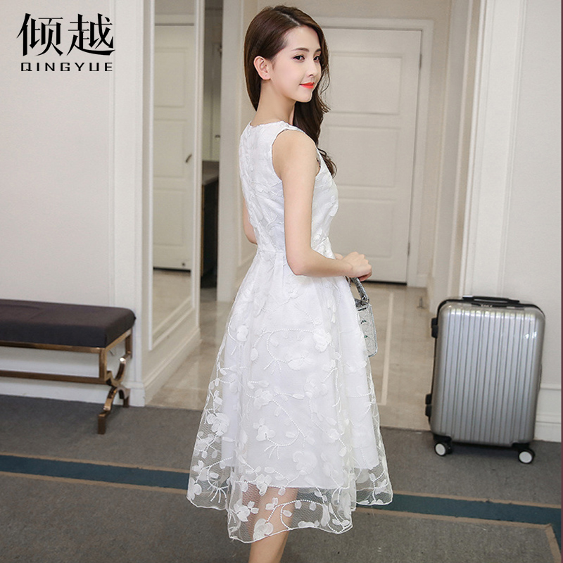 傾越2017新款蕾絲連衣裙夏季長款修身顯瘦背心裙甜美小清新沙灘裙