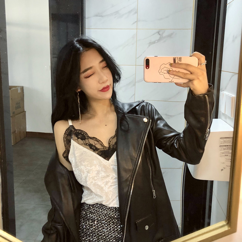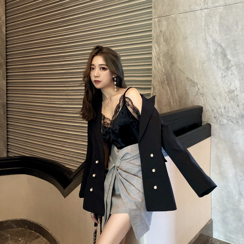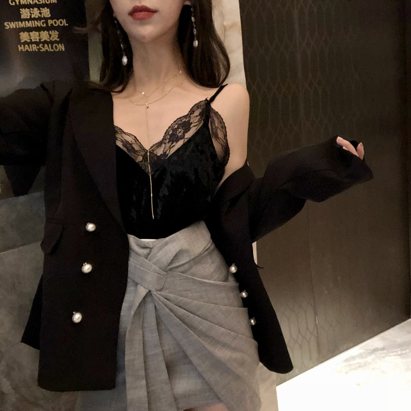 / 時尚套裝新款小心機吊帶背心V領性感露肩蕾絲上衣西裝外套兩件套