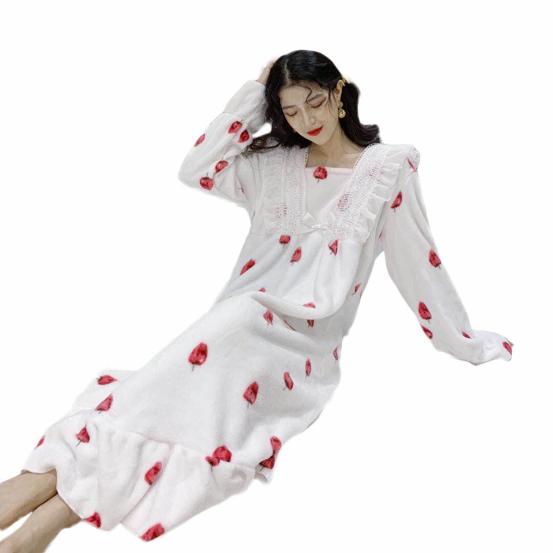 秋裝韓版時尚毛絨絨加厚荷葉邊長袖睡衣連衣裙睡裙家居服女士長裙