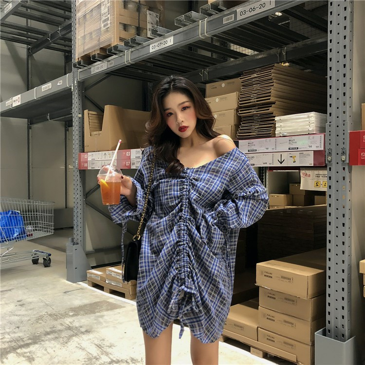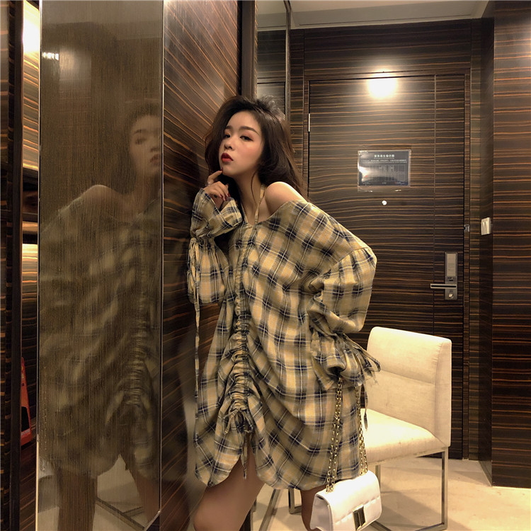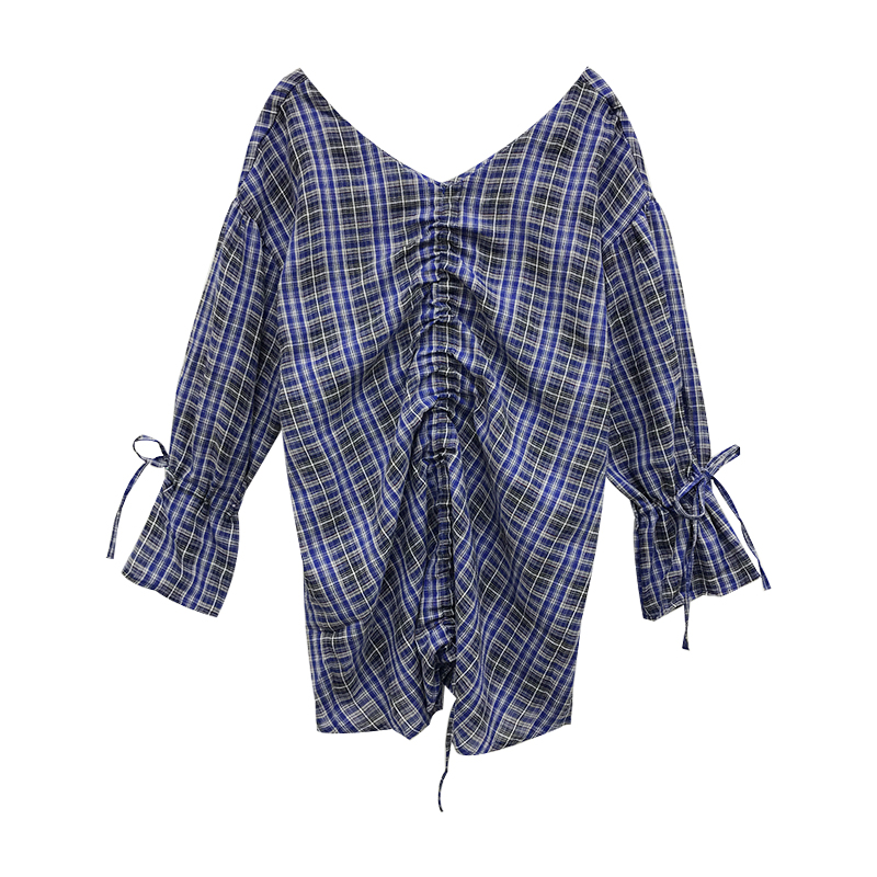 / 復古洋氣時髦抽繩格子喇叭袖兩穿襯衫女夏2018新款顯瘦連衣裙上衣