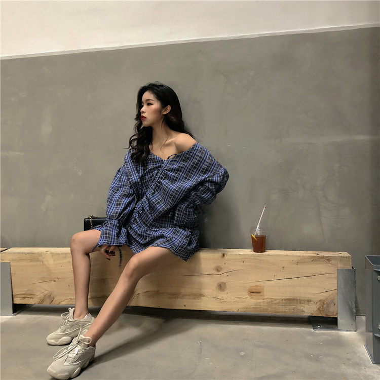 秋裝女2018新款氣質潮流百搭顯瘦復古格子一字肩燈籠袖兩穿上衣