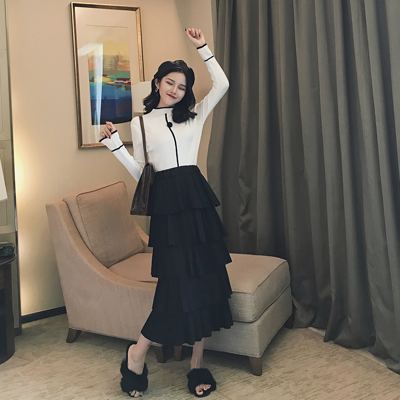 / 2018秋裝新款韓版晚晚風時尚套裝長袖打底衫上衣高腰蛋糕裙兩件套