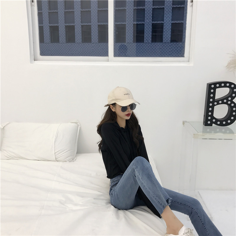 港味復古chic褲子煙灰色破洞高腰顯瘦毛邊牛仔九分小腳褲鉛筆褲潮