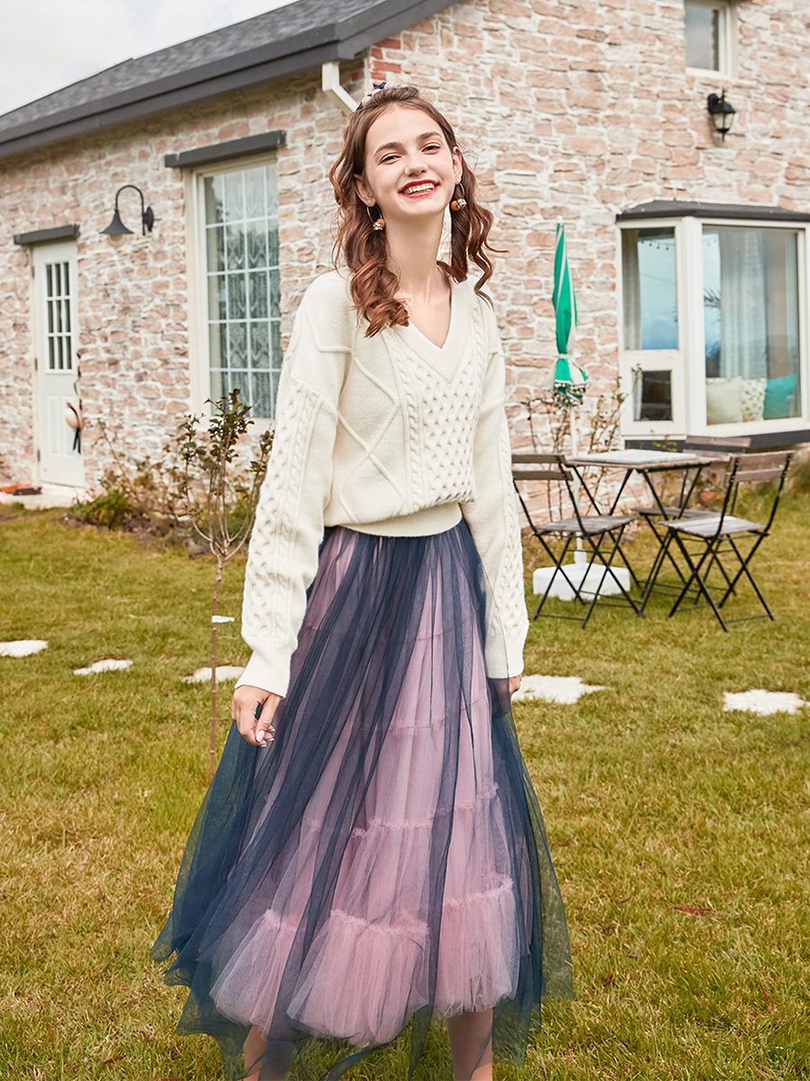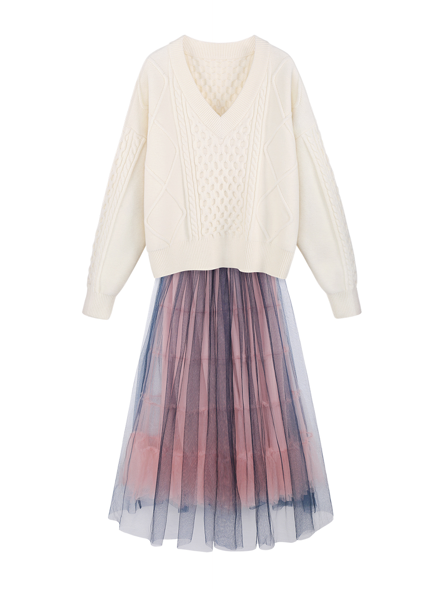 MG小象長袖v領針織衫女秋冬新款性感網紗吊帶裙慵懶風chic毛衣潮