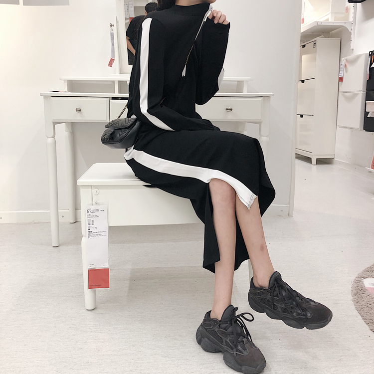 / 港風裙秋新款韓版時尚chic黑白拼色長款休閑裙立領設計款連衣裙女