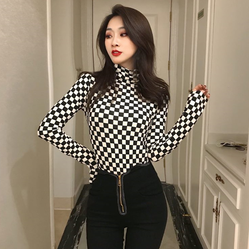 衣服2018新款女裝秋冬內搭長袖T恤港味修身千鳥格高領打底衫上衣