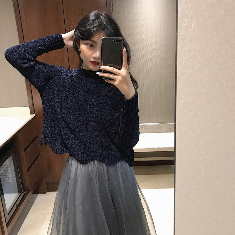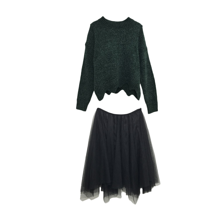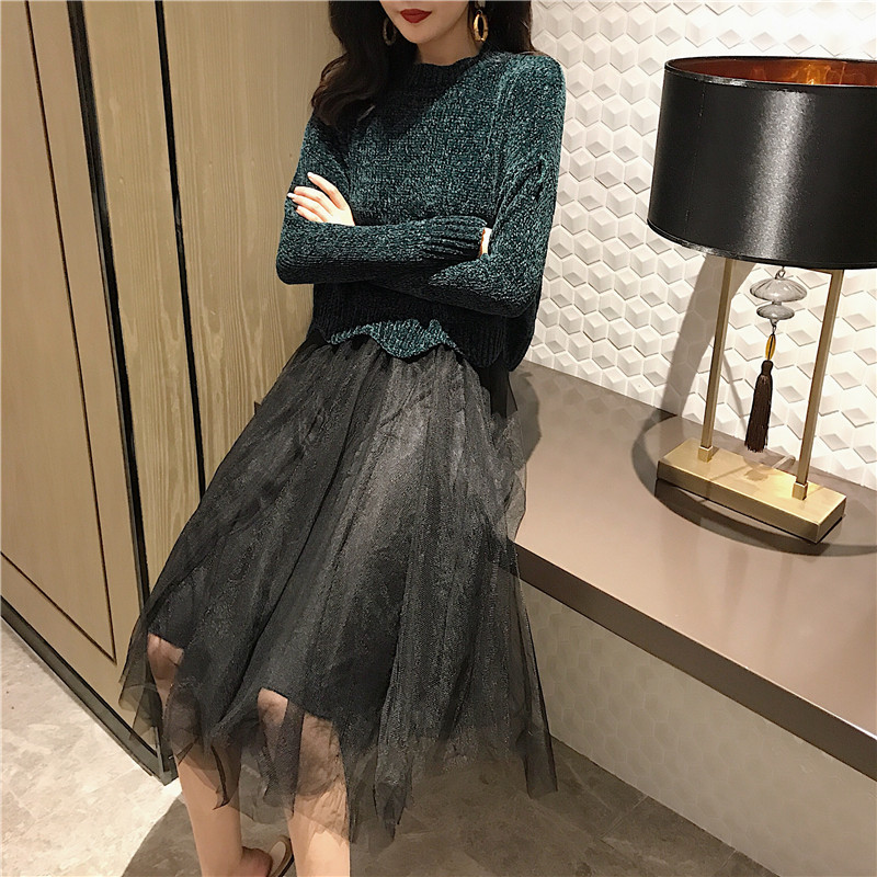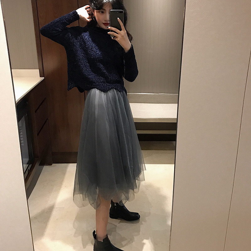 秋裝女2018新款寬松不規則慵懶針織毛衣女+百搭網紗半身裙兩件套