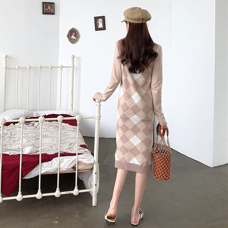 學院風撞色菱格針織裙女秋冬裝2018新款韓版中長款背心連衣裙子潮