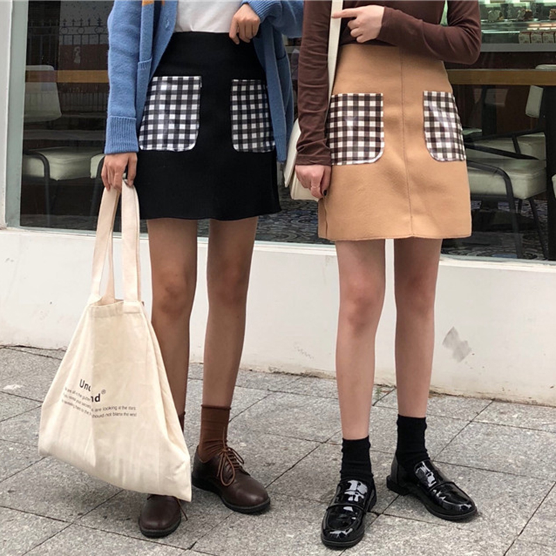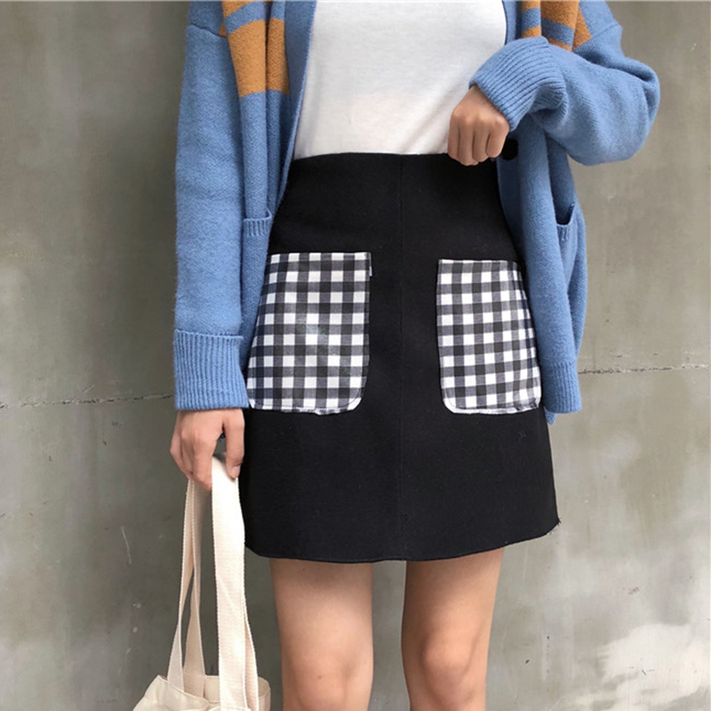 拼接格子口袋毛呢A字裙女秋冬裝2018新款韓版高腰顯瘦半身短裙子