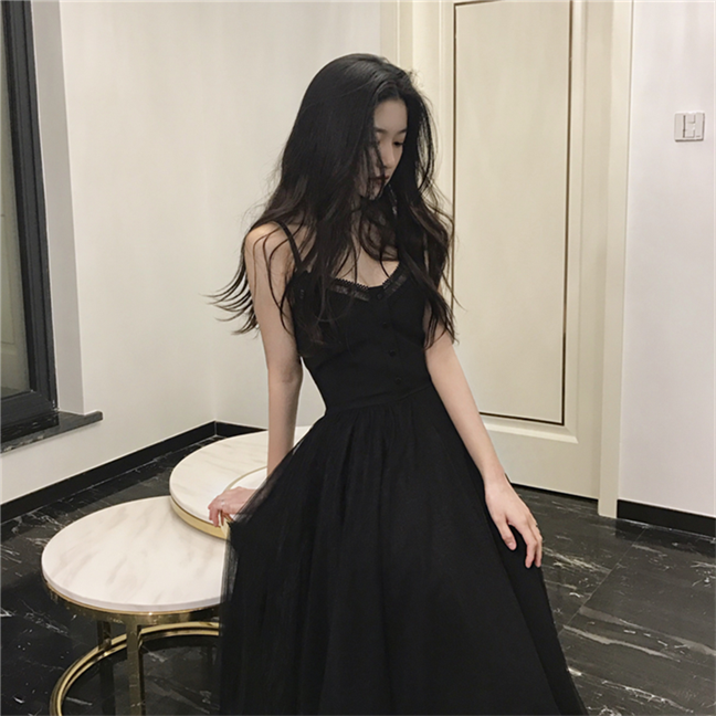 / 秋裝2018新款女蕾絲吊帶拼接連衣裙百搭純色寬松V領顯瘦中長裙潮