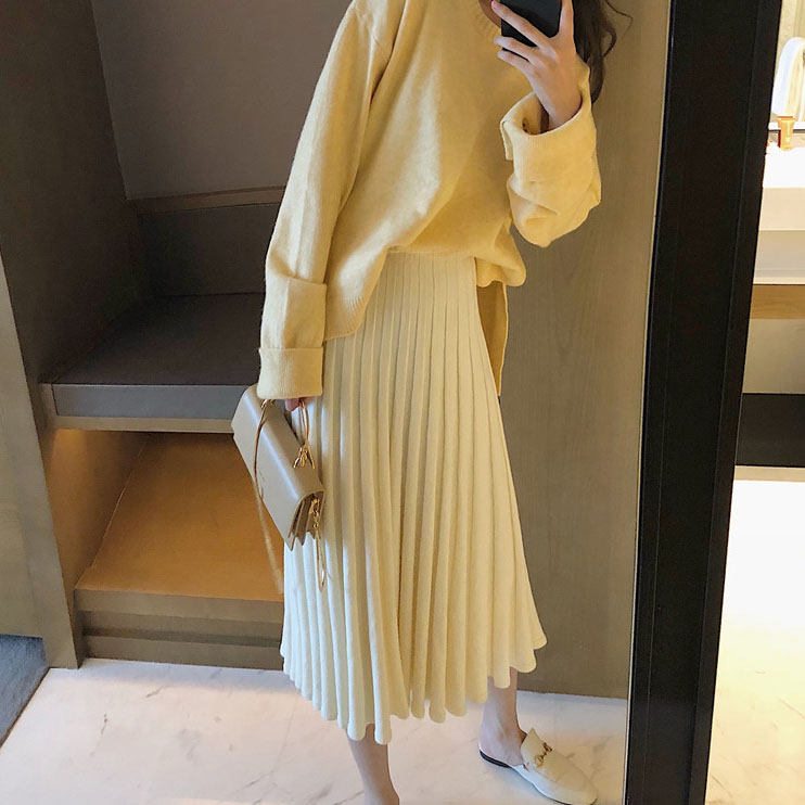 女神套裝秋慵懶風毛衣套頭長袖針織衫+復古寬松中長款百褶半身裙