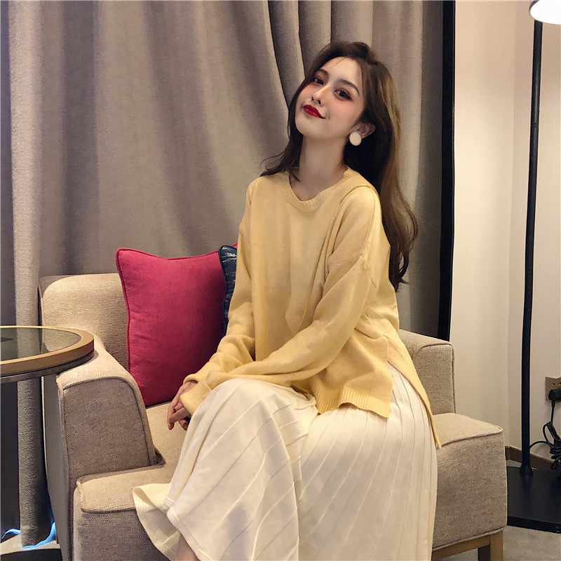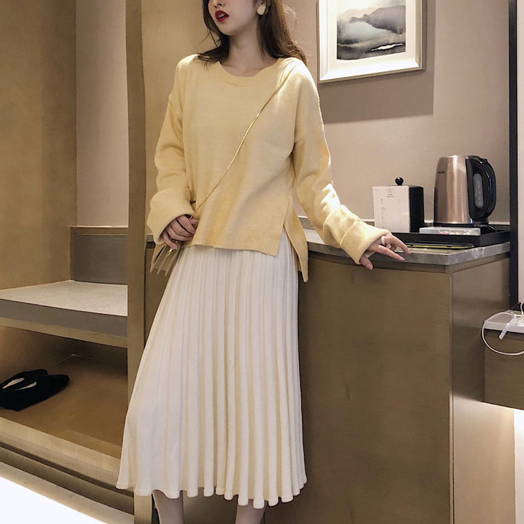 / 女神套裝秋慵懶風毛衣套頭長袖針織衫+復古寬松中長款百褶半身裙