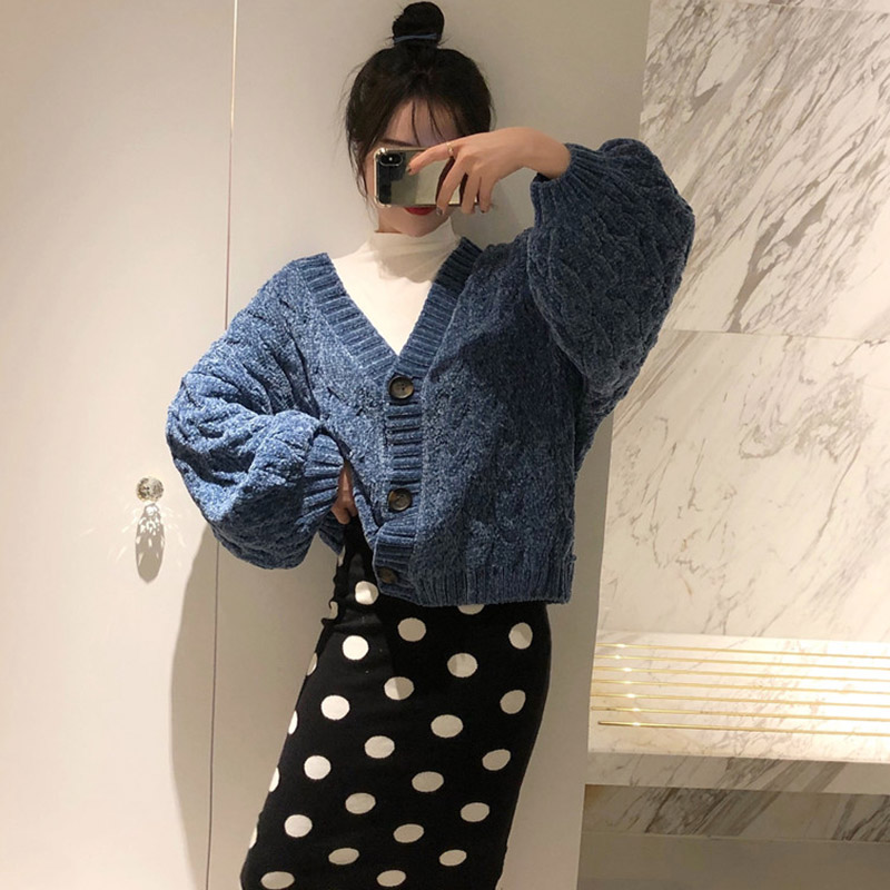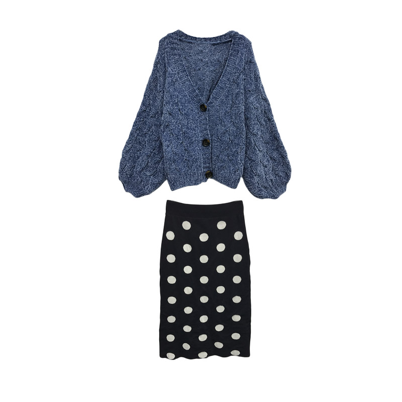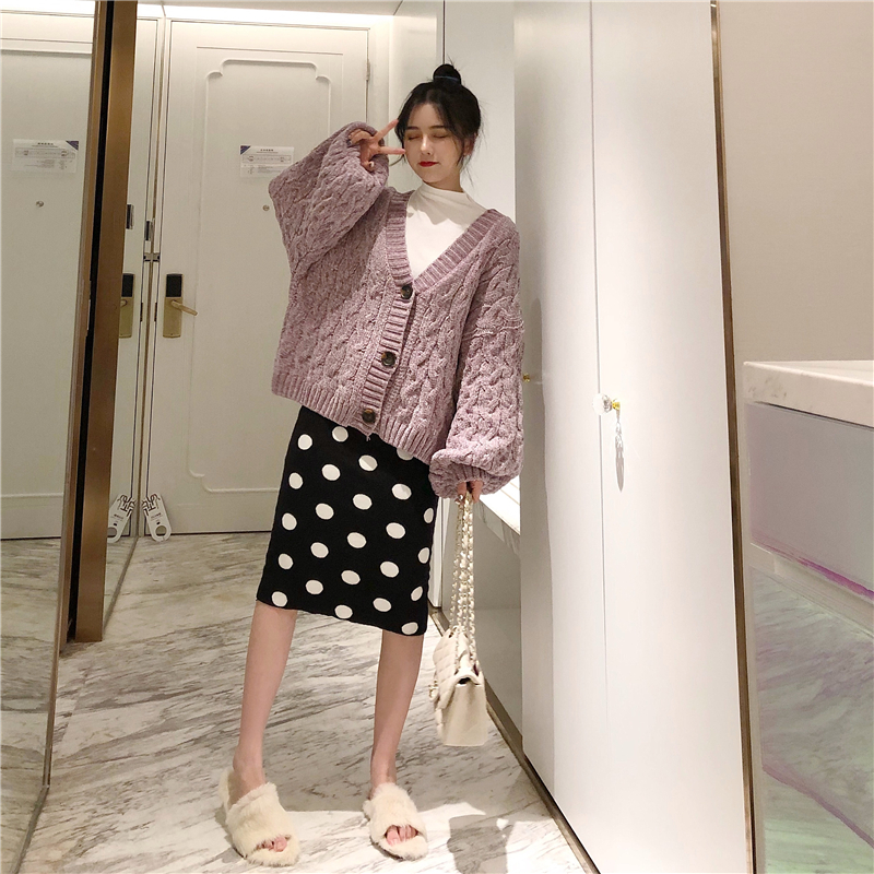 港味秋裝女2018新款套裝短款麻花毛衣開衫+波點針織半身裙兩件套