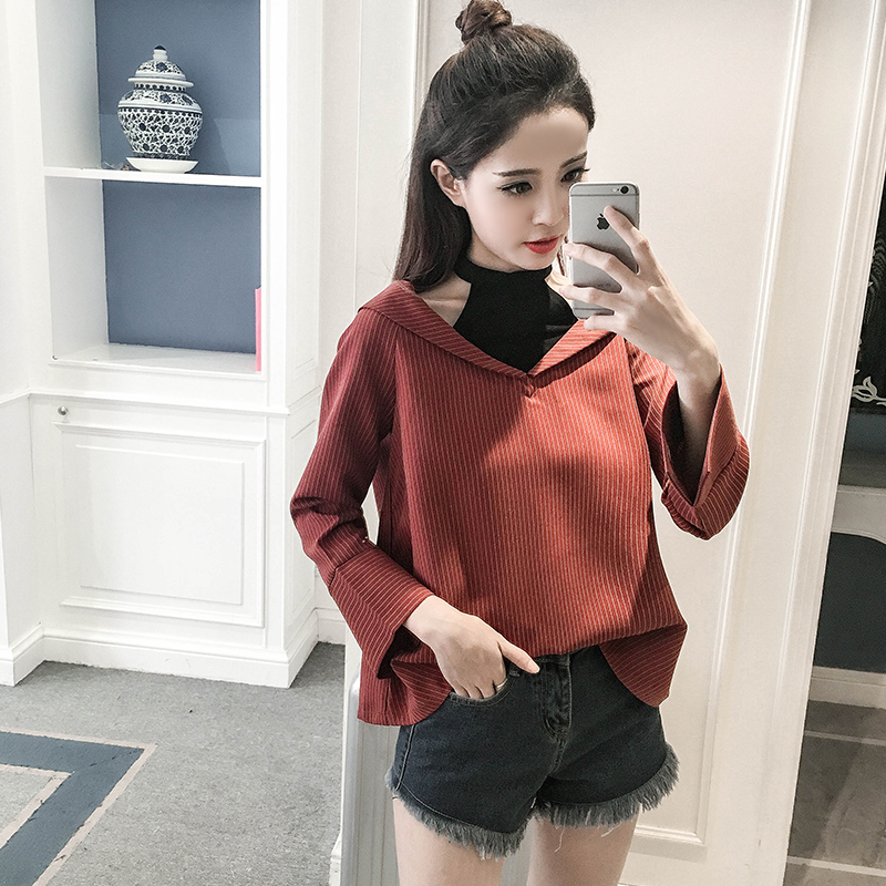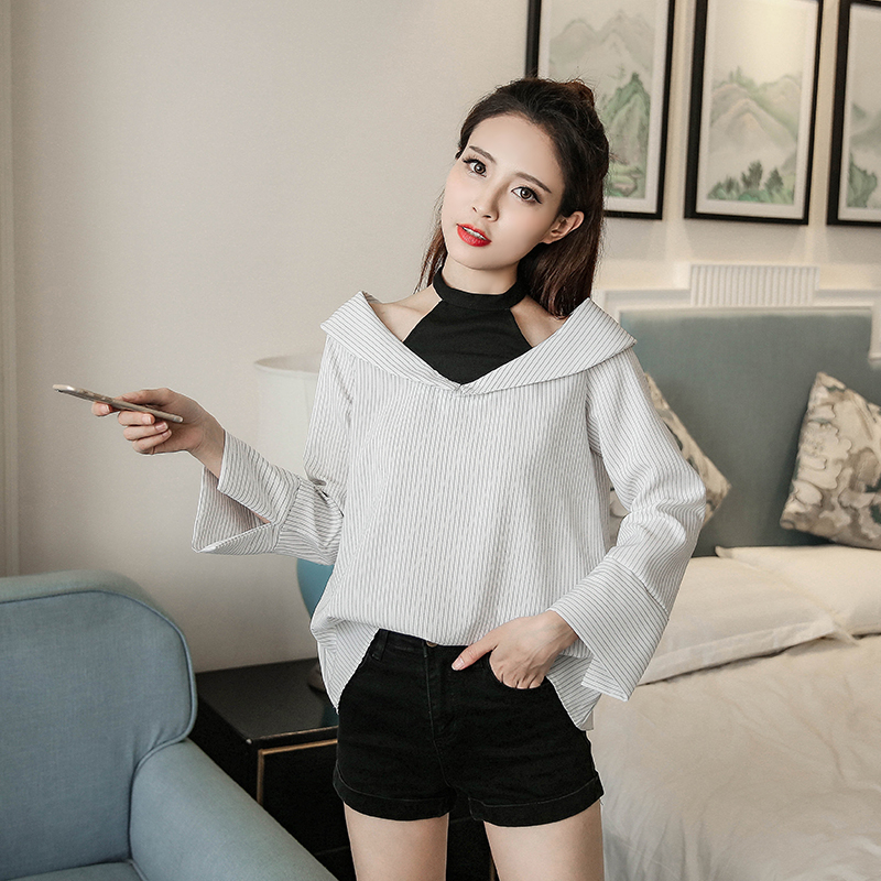 春秋新款女裝韓范假兩件襯衫寬松百搭長袖襯衣條紋露肩上衣潮