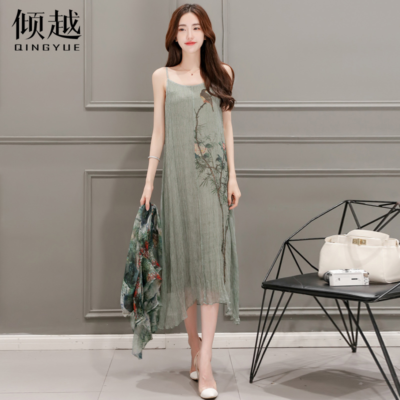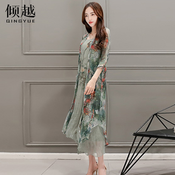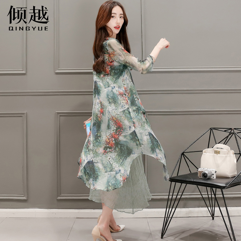 傾越2017春裝新款女裝韓版七分袖開衫兩件套套裝裙民族風連衣裙潮