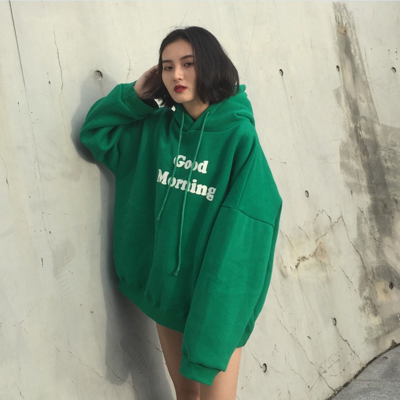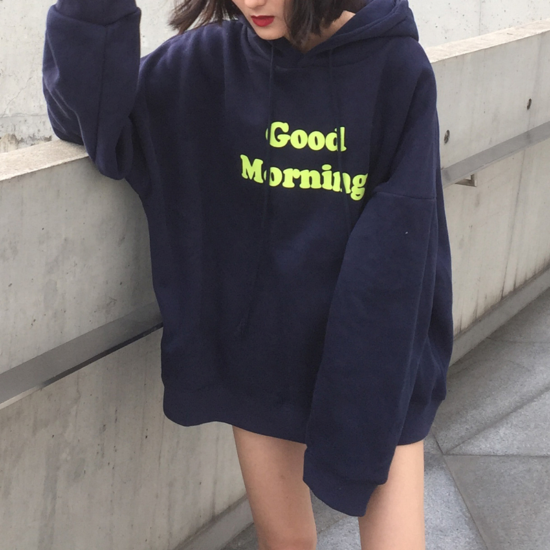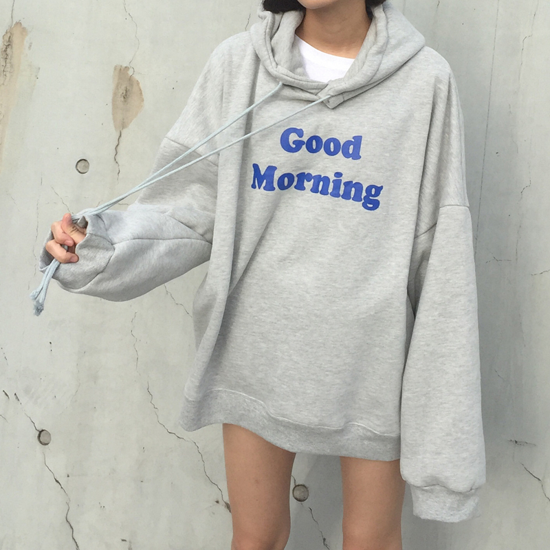 早上好英文寬松連帽加絨衛衣女2018新款chic早秋學生韓版套頭上衣