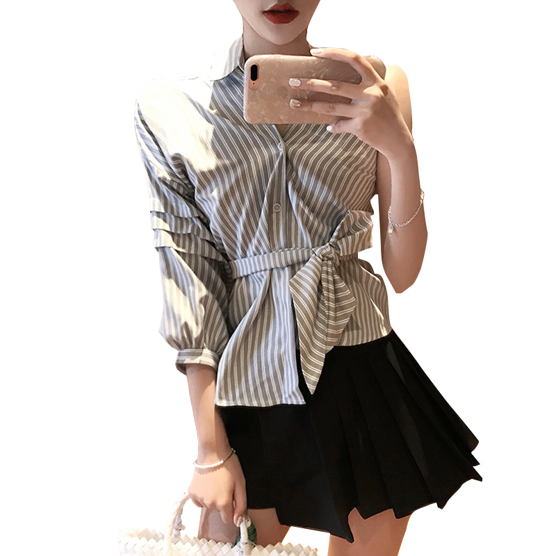 / 套裝女夏新款女裝韓版個性斜領露肩綁帶條紋襯衫+百褶高腰裙褲潮