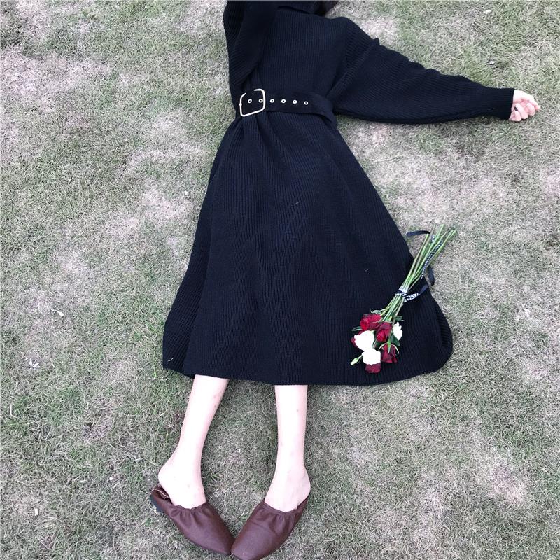 / 慵懶風套頭毛衣女2018新款秋冬季一件式加厚高領毛衣連衣裙配腰帶