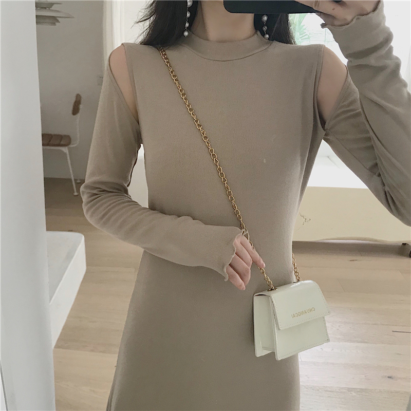chic早秋裙子長裙女慵懶風港味復古氣質內搭挖肩設計木耳邊連衣裙