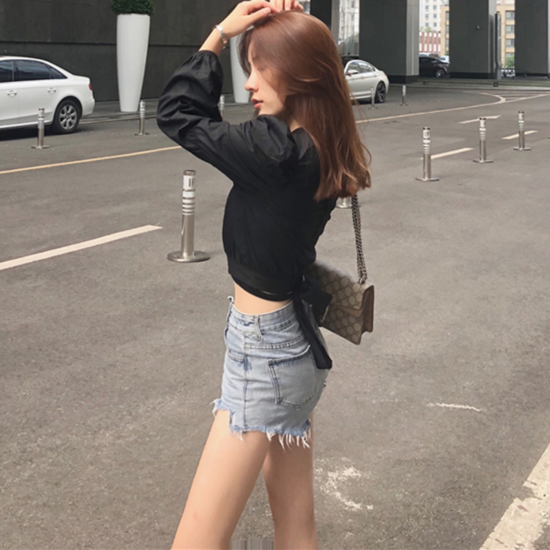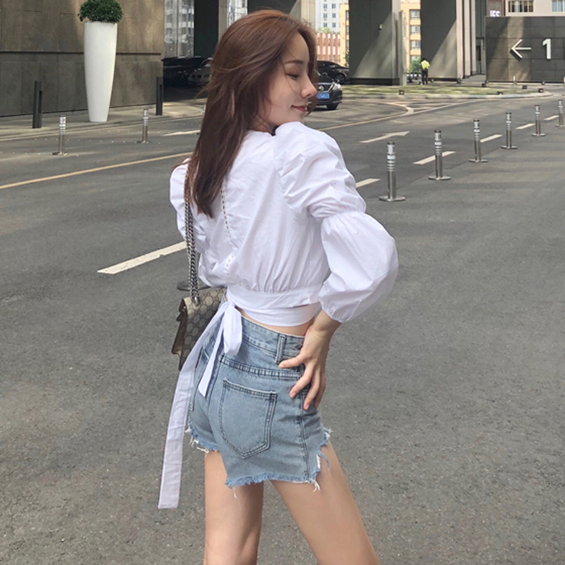 / 氣質泡泡袖露臍上衣早秋新款女裝鏤空交叉V領綁帶短款長袖白襯衫