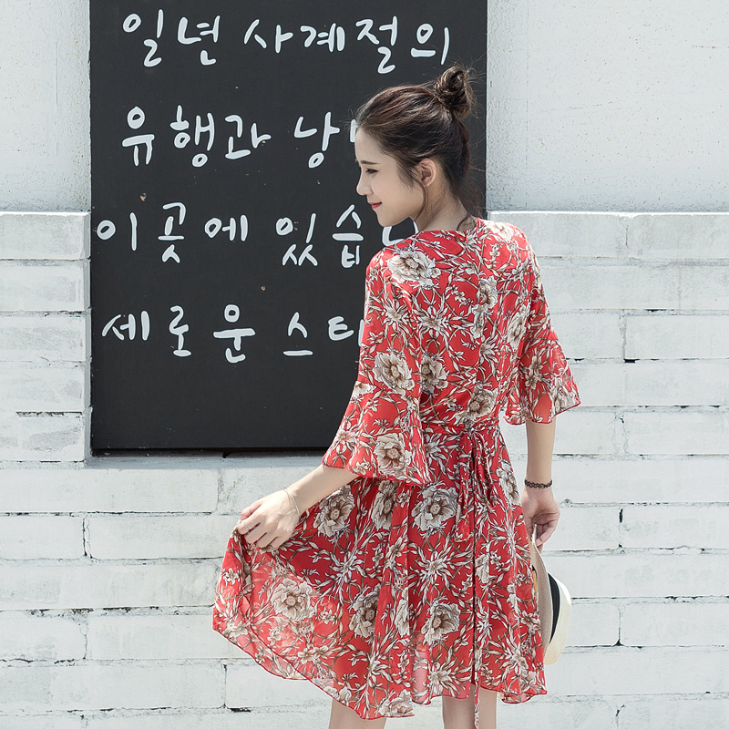 / 夏裝新款小碎花雪紡連衣裙女韓版V領系帶喇叭袖顯瘦高腰裙子