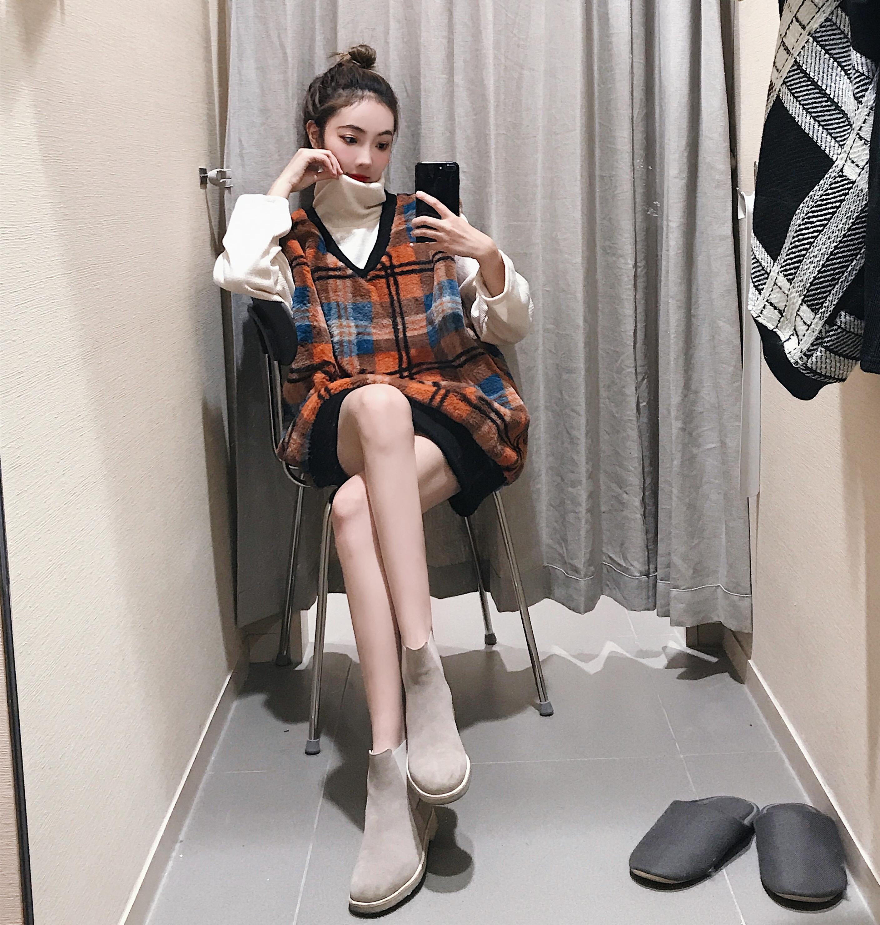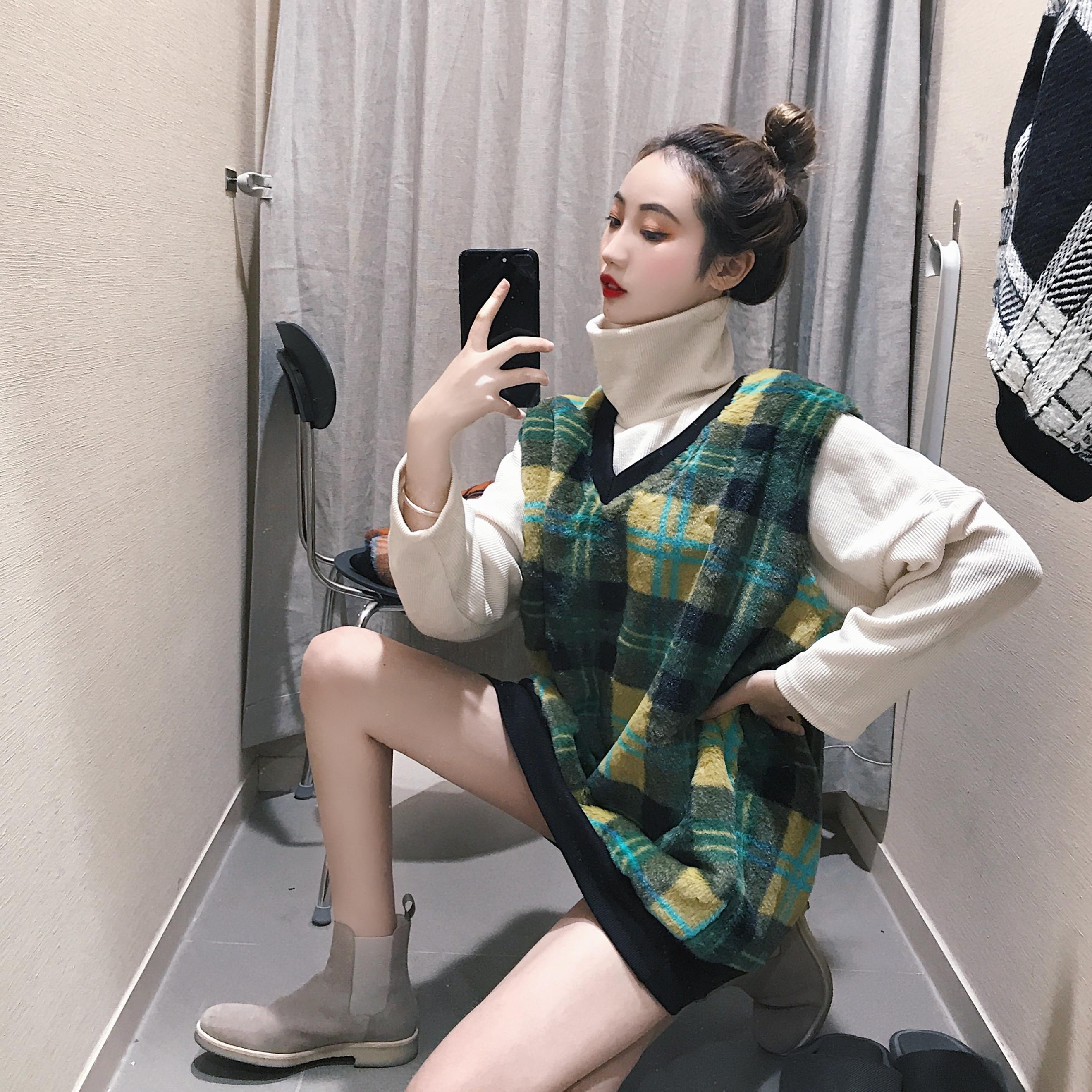 / 港風時尚套裝新款復古格子毛絨厚背心馬甲高領中長款打底衫兩件套