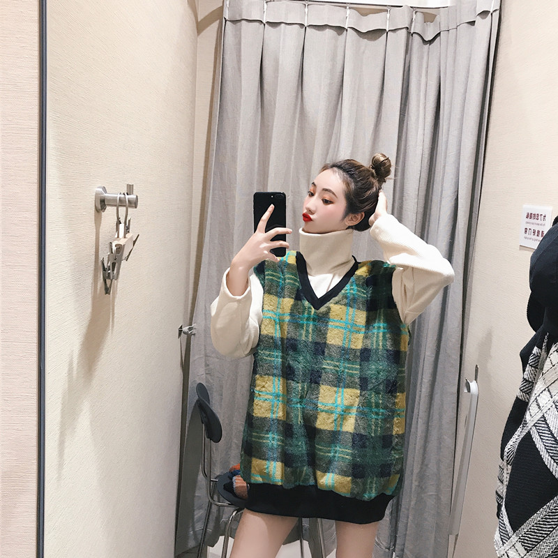 港風時尚套裝新款復古格子毛絨厚背心馬甲高領中長款打底衫兩件套