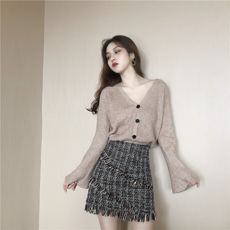 / 秋裝新款韓版時尚套裝V領喇叭袖毛衣針織開衫粗呢高腰a字半身裙女