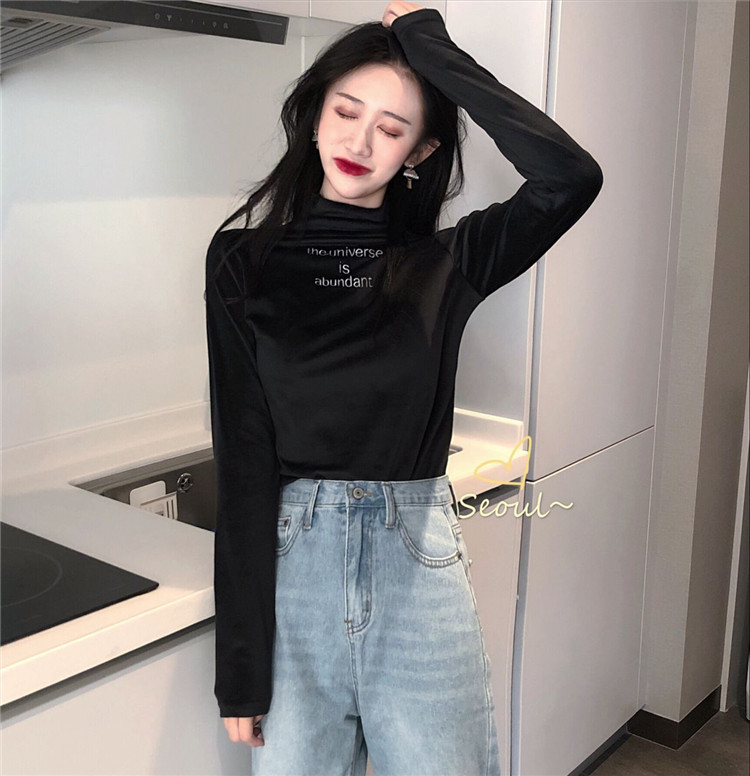 冬裝上衣女慵懶長袖t袖女時尚純色絲絨半高領字母刺繡百搭打底衫