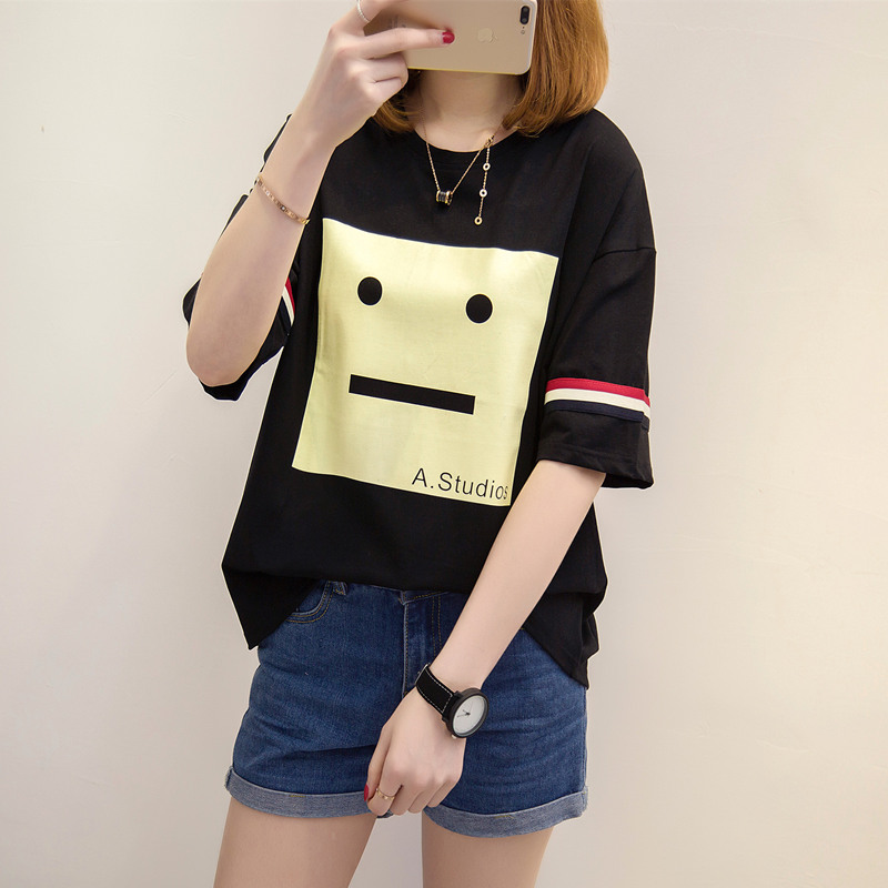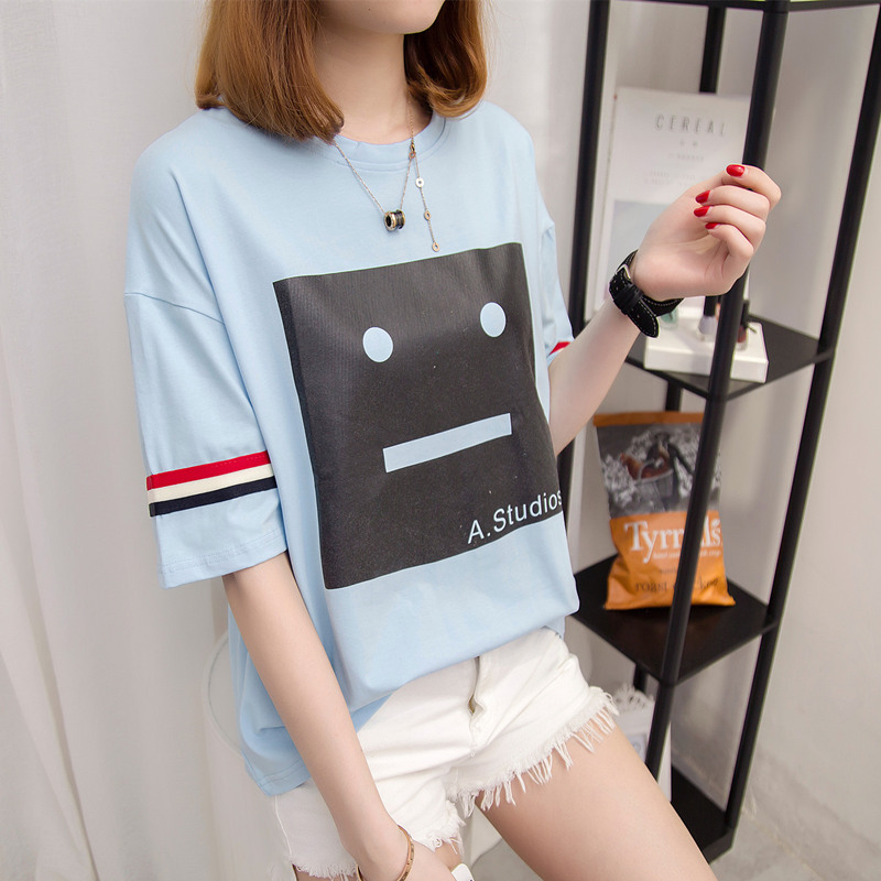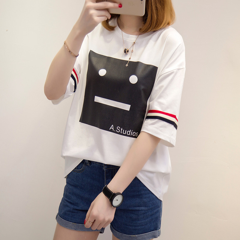 / 夏裝新款女裝條紋t恤女短袖韓版卡通寬松打底體恤衫百搭上衣