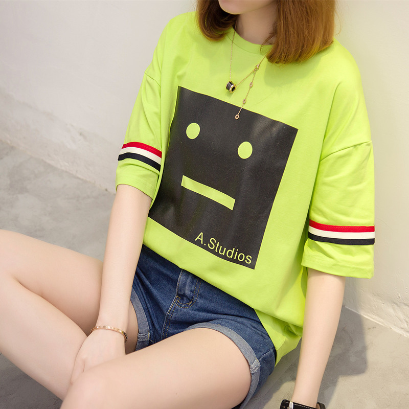 夏裝新款女裝條紋t恤女短袖韓版卡通寬松打底體恤衫百搭上衣