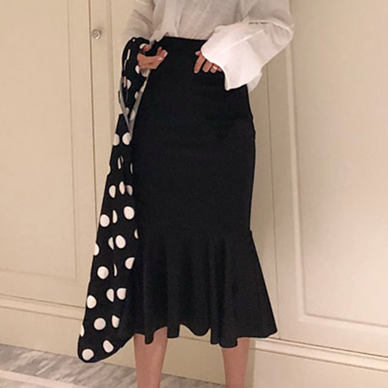 / 復古風波點高腰顯瘦半身裙子女秋冬裝新款韓版學生黑色魚尾中長裙