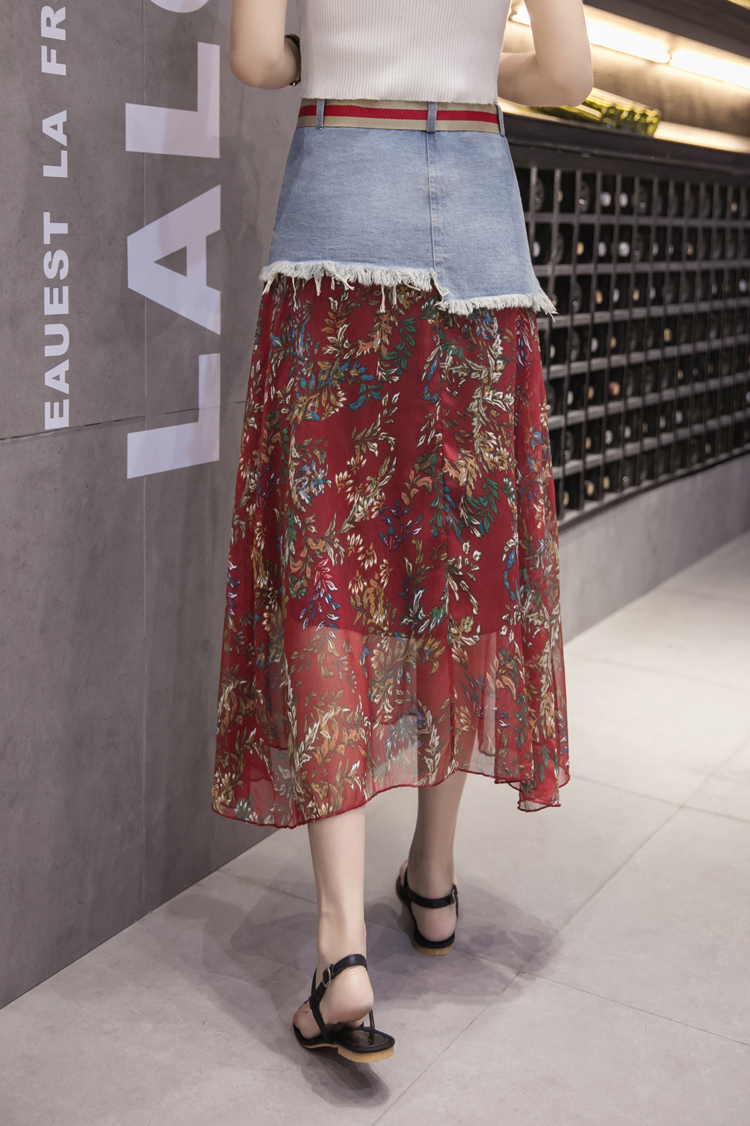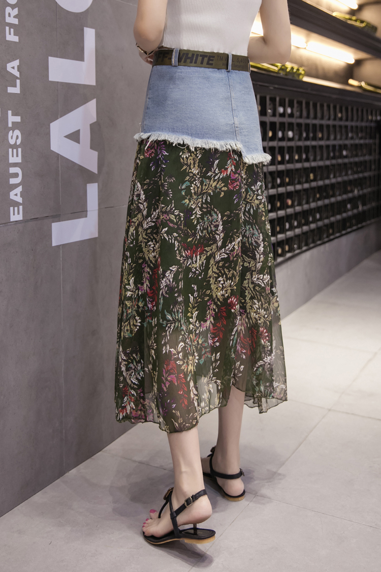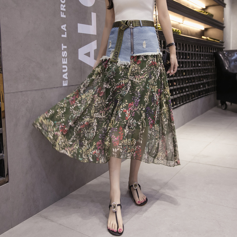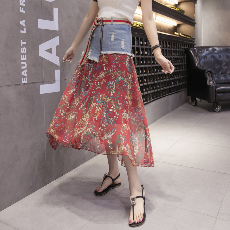 / 韓版牛仔拼接半身裙女中長款雪紡碎花裙子高腰A字裙半裙沙灘裙夏