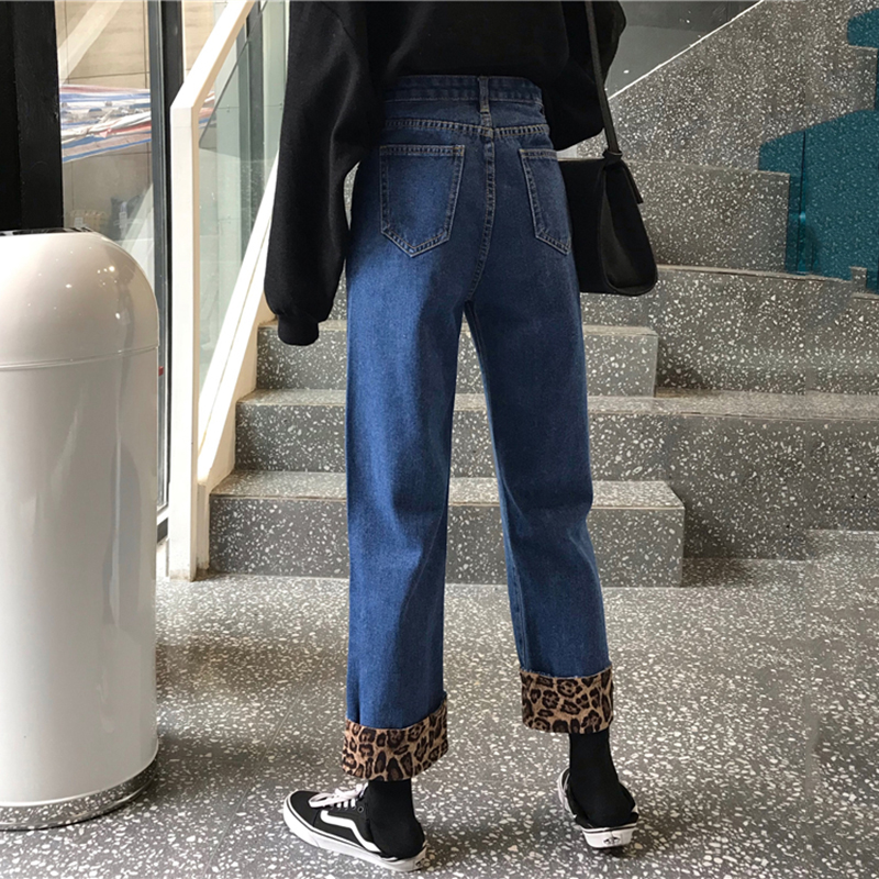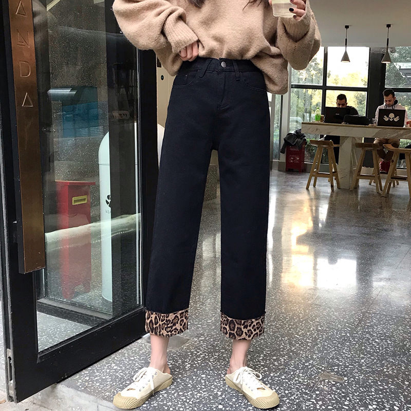 2018秋冬新款韓版女裝學生腰拼色豹紋直筒褲牛仔卷邊九分闊腿褲子