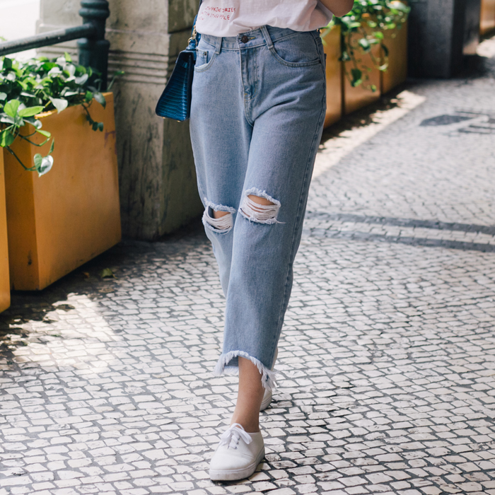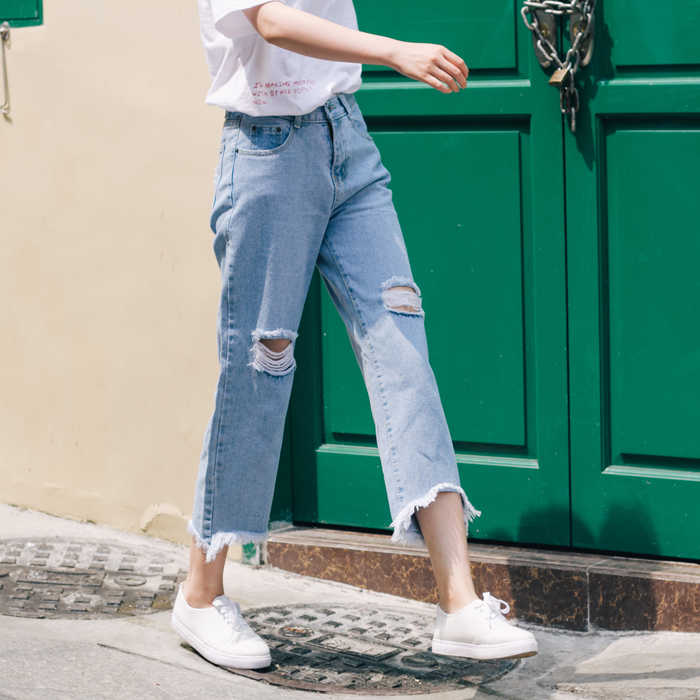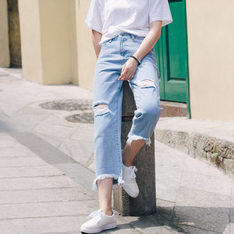 / 2018夏季新款寬松顯瘦破洞淺色牛仔闊腿褲韓版休閑九分褲子女學生