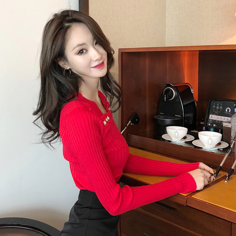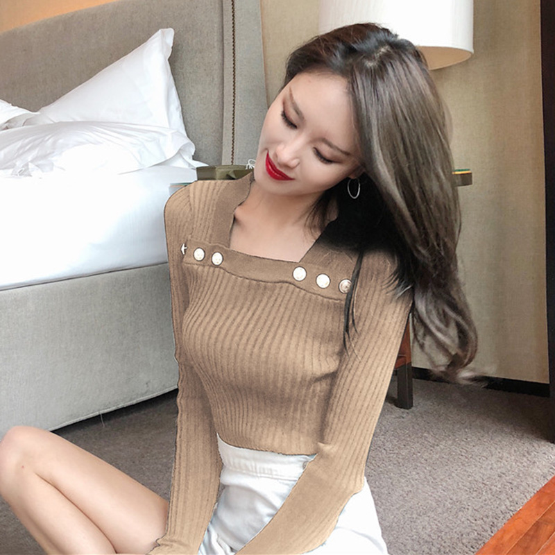 / 紐扣裝飾方領套頭針織衫秋裝女2018新款chic氣質黑色長袖打底上衣