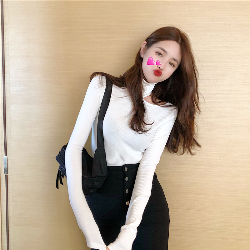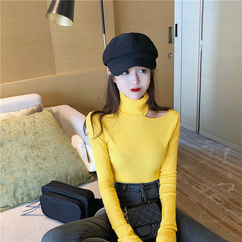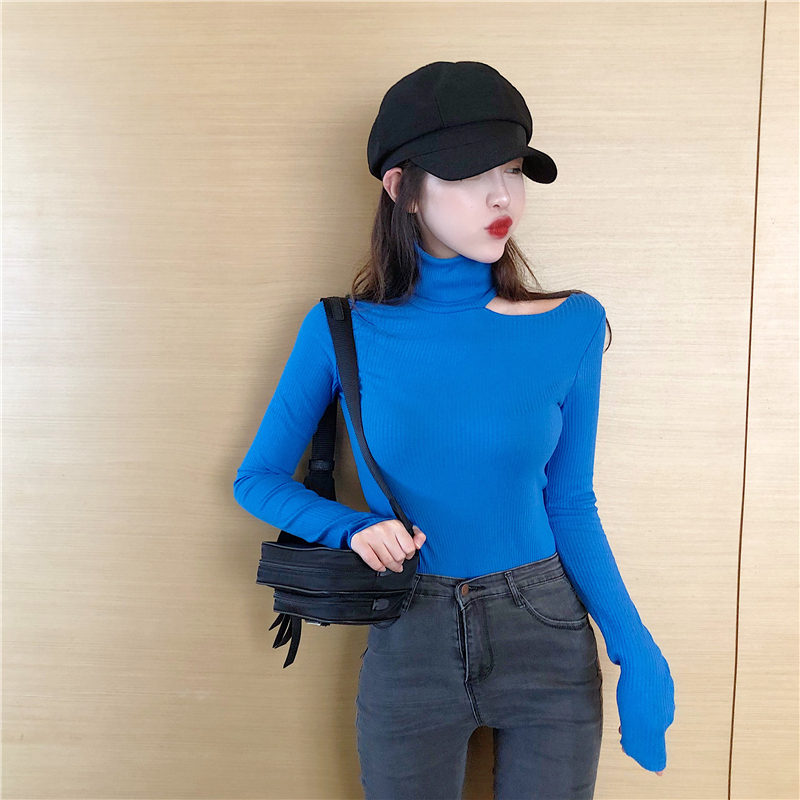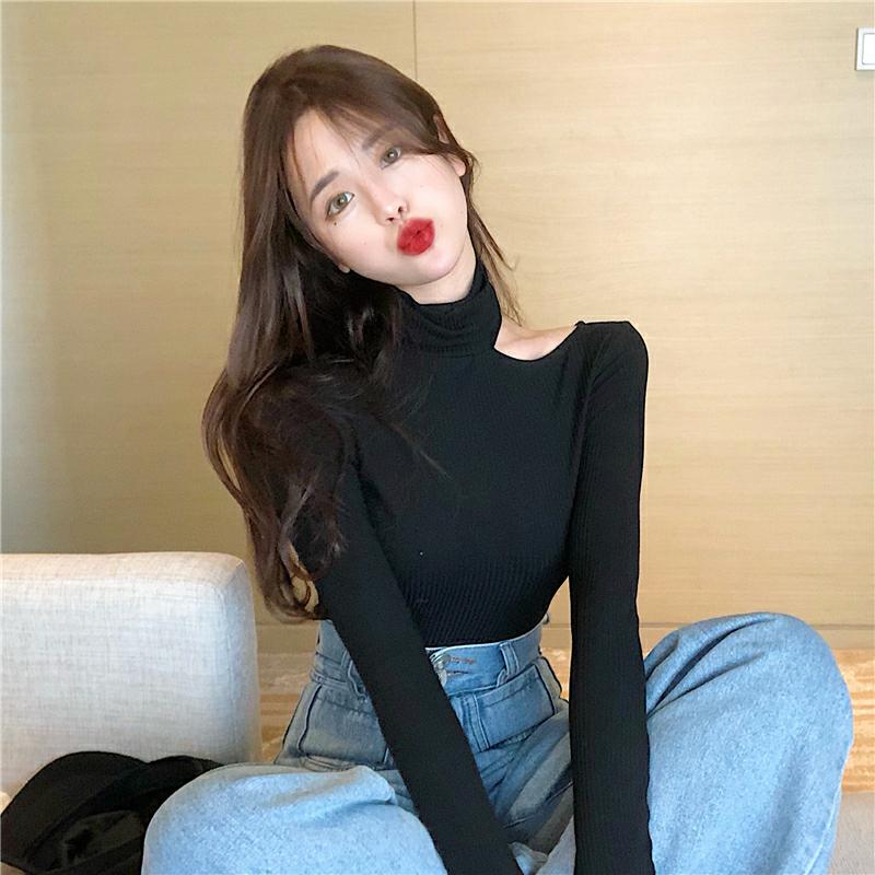 chic復古早秋上衣新款百搭打底衫單肩露肩高領修身顯瘦長袖T恤女