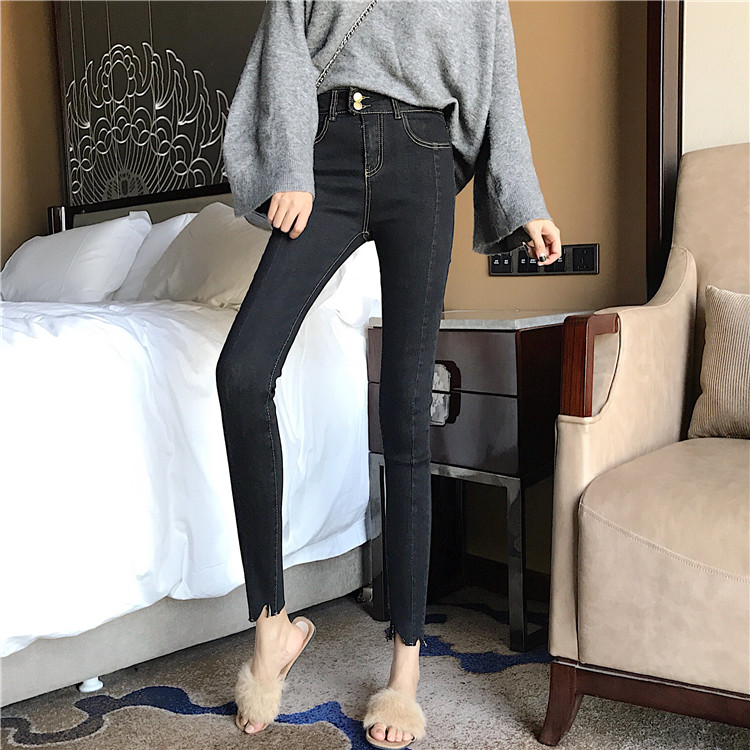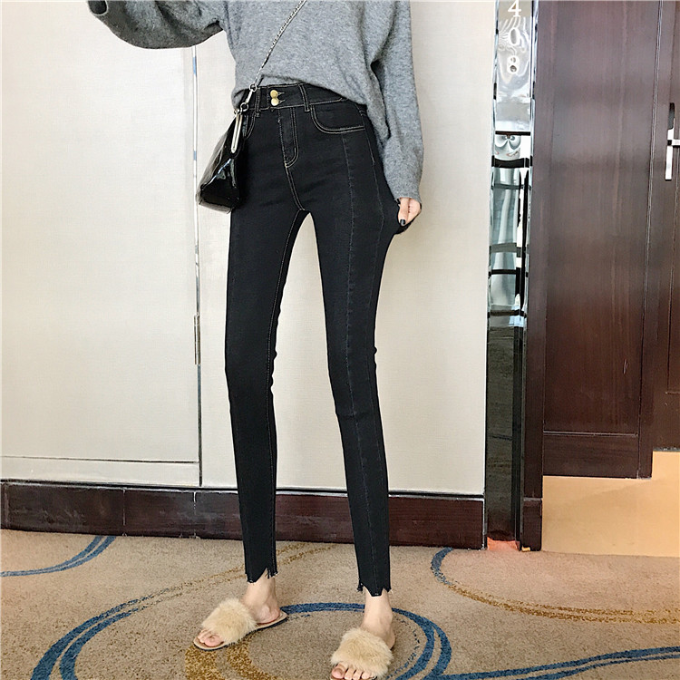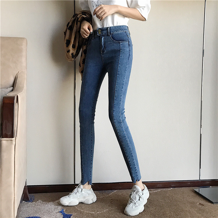 港味復古chic褲子高腰修身顯瘦不規則剪邊彈力牛仔褲小腳鉛筆褲女