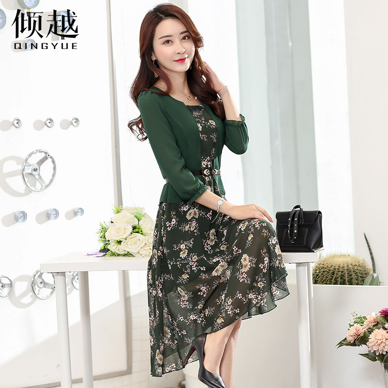 傾越2017春裝新款女裝氣質假兩件針織雪紡連衣裙女長袖碎花打底裙