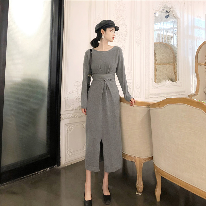 / 韓國復古風連衣裙女秋冬2018新款百搭收腰綁帶修身顯瘦長款針織衫