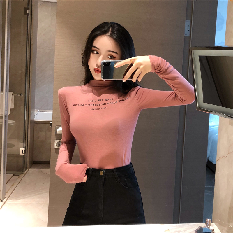 / 新款韓版復古chic秋季顯瘦外穿上衣百搭印花半高領長袖T恤打底衫