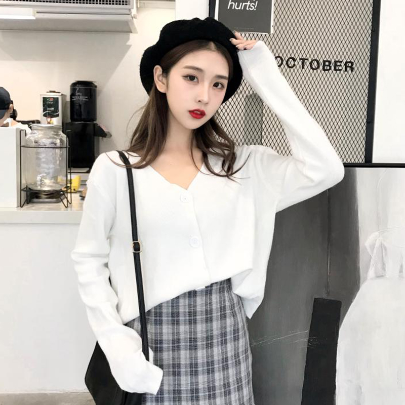 / 女秋季新款韓版長袖針織開衫外套上衣+高腰格子a字半身裙時尚套裝