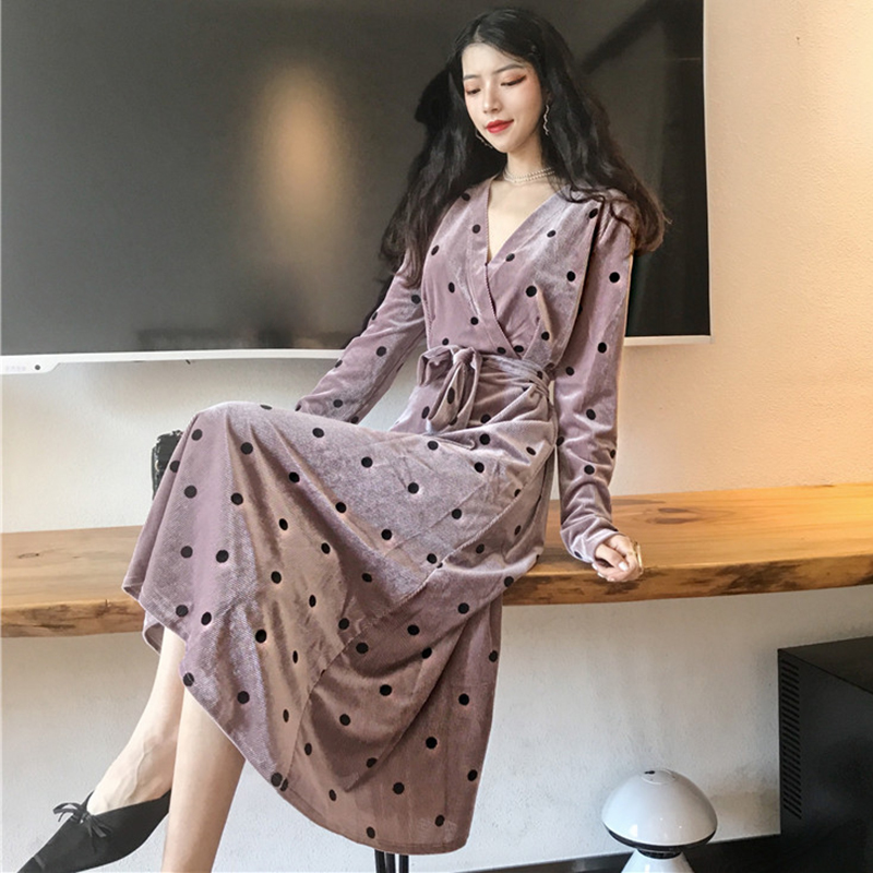 / 復古風波點燈芯絨V領長袖連衣裙秋冬裝新款高腰法式少女茶歇裙子