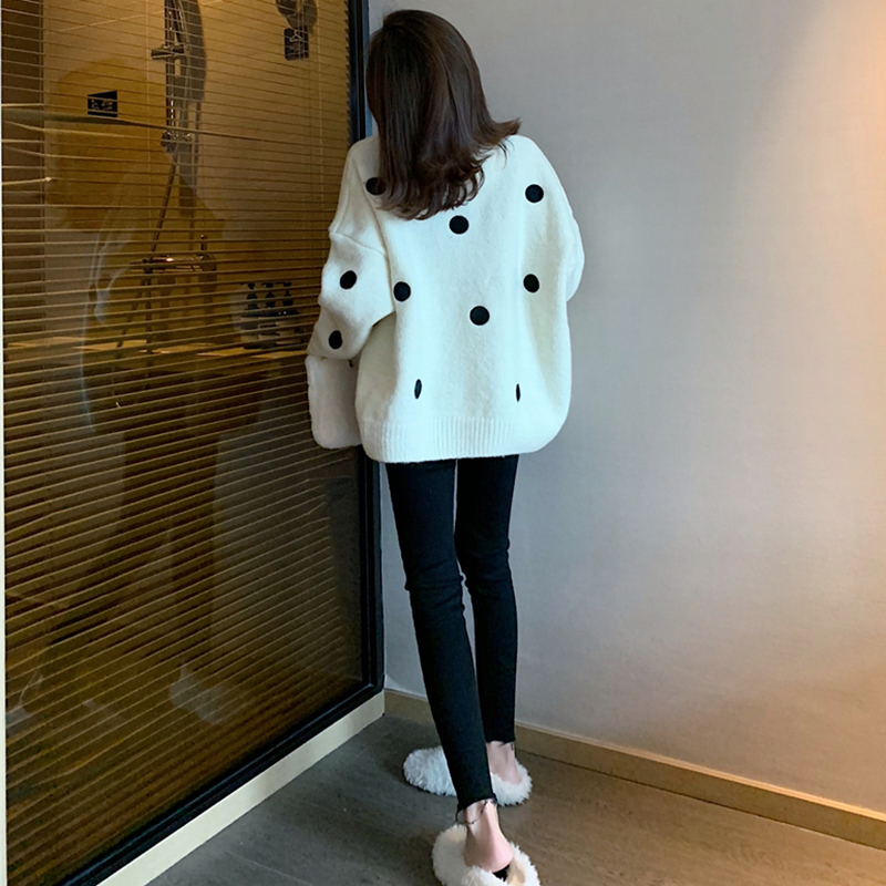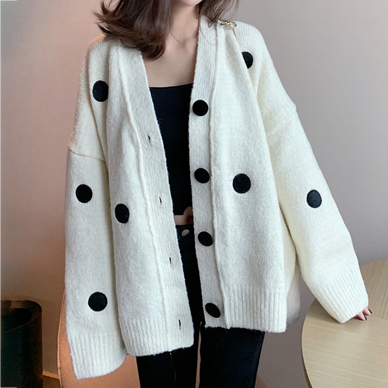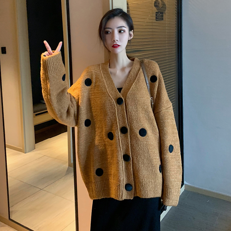 chic慵懶寬松V領針織開衫女秋冬裝2018新款韓版時尚波點毛衣外套