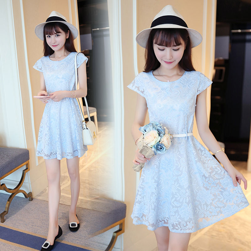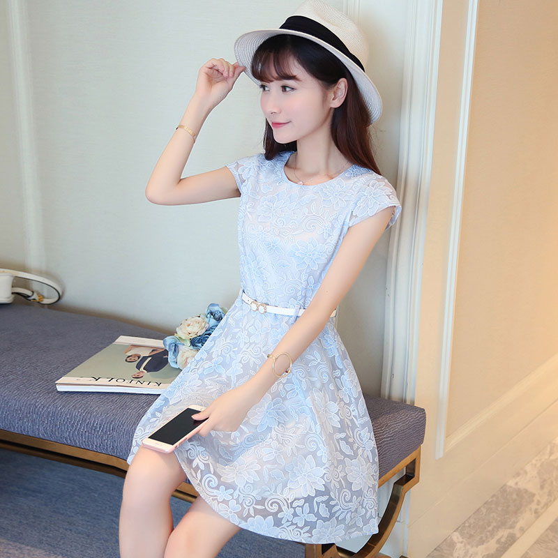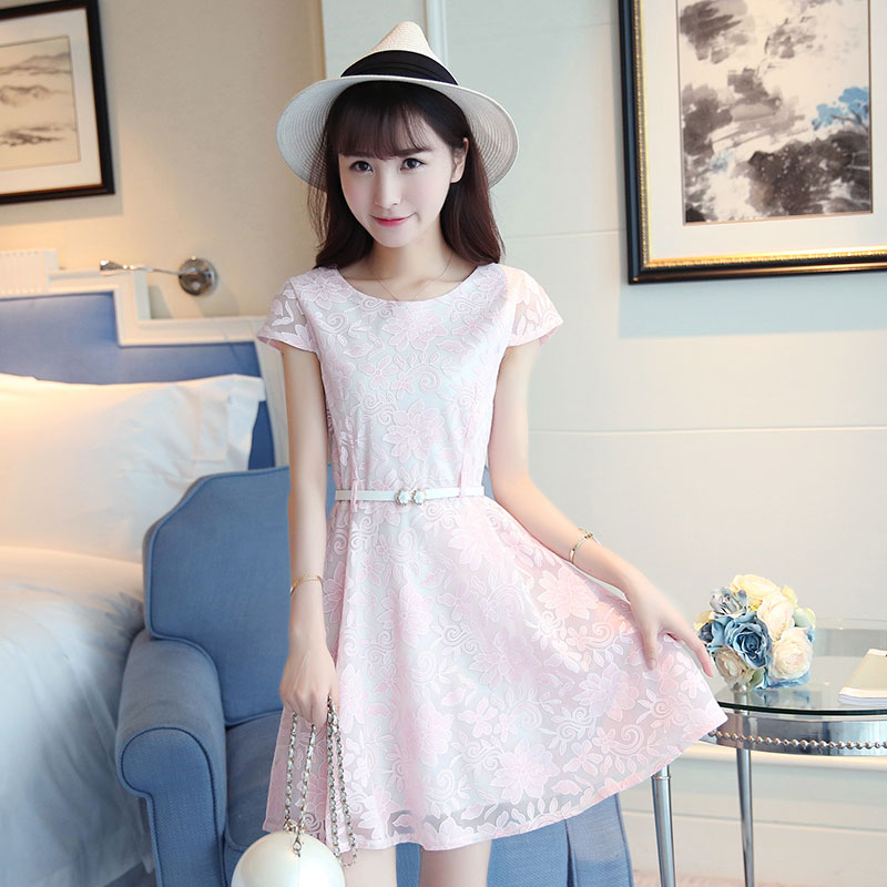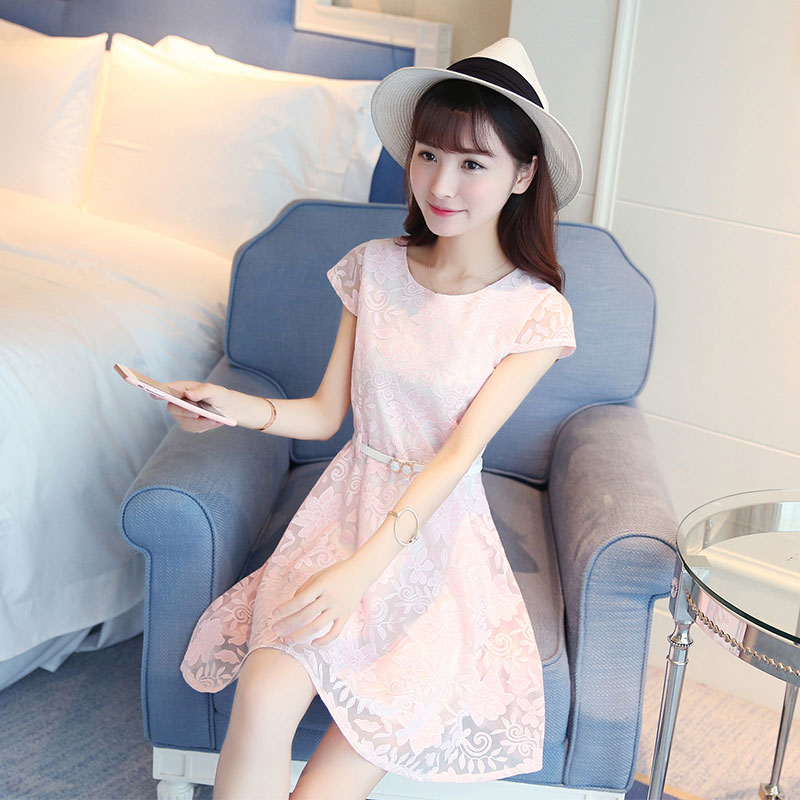 / 夏季新款女裝A字裙小清新修身顯瘦蕾絲短袖時尚連衣裙 中裙女