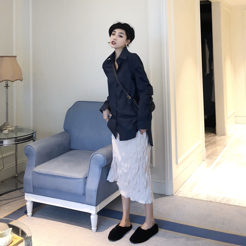 / 秋冬新款韓版袖子設計感寬松長袖襯衫+高腰褶皺中長款半身裙套裝