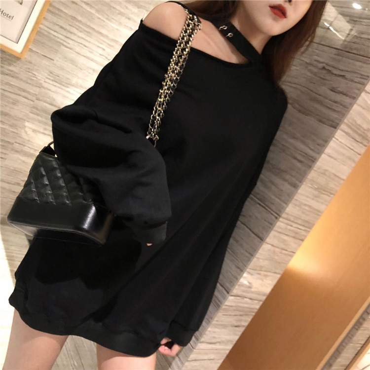 chic早秋上衣慵懶中長款純色衛衣女秋2018新款高領加絨露肩掛脖女